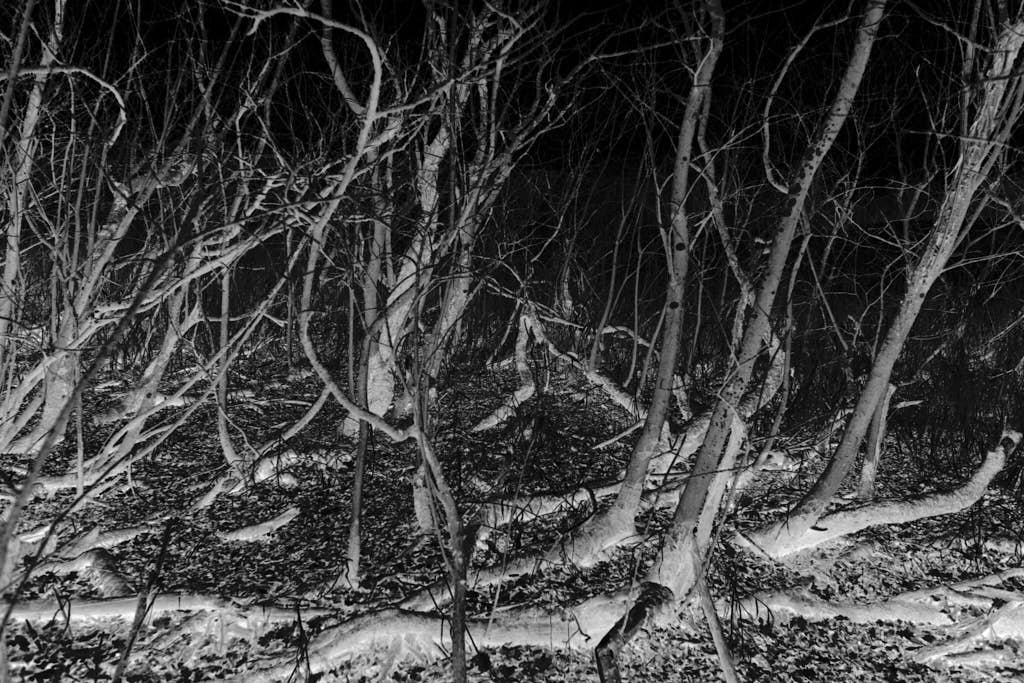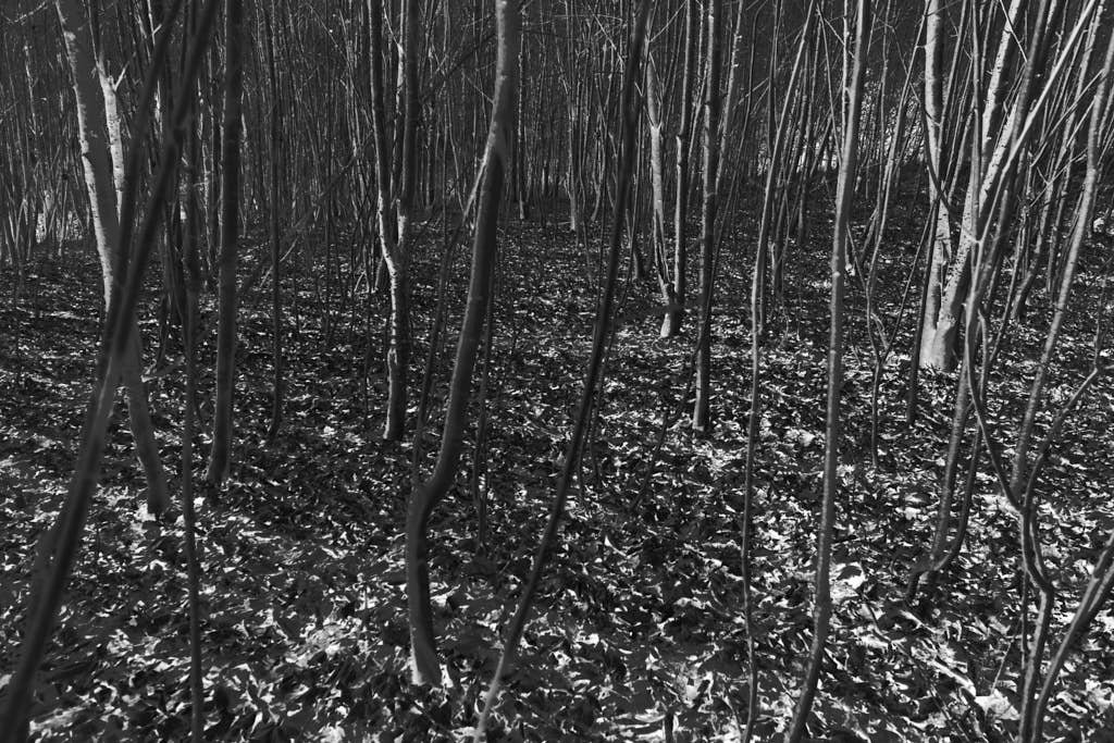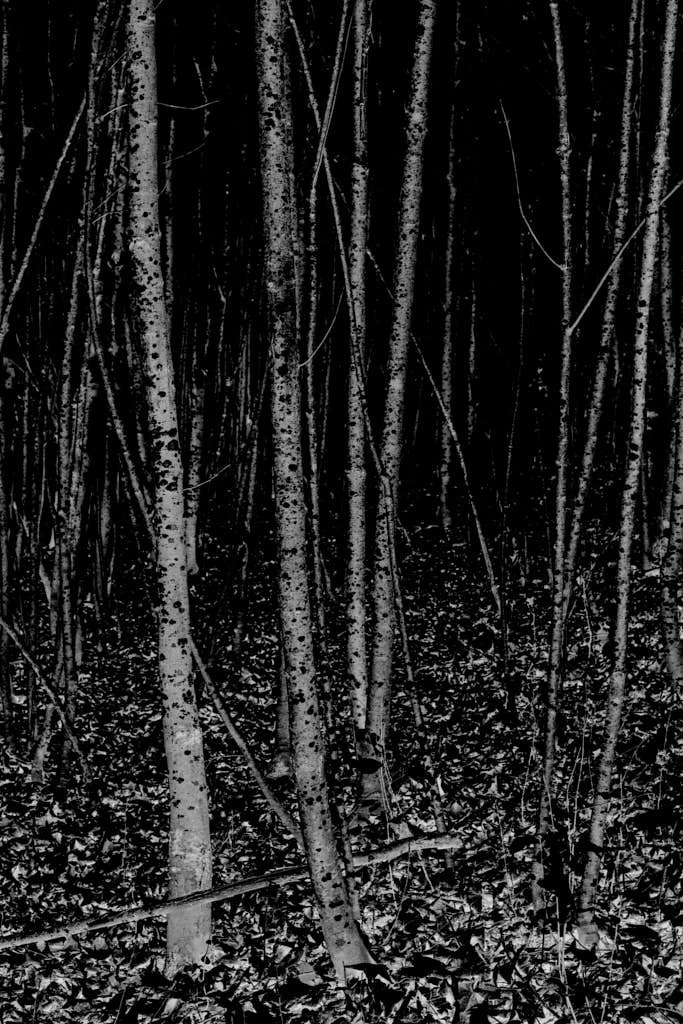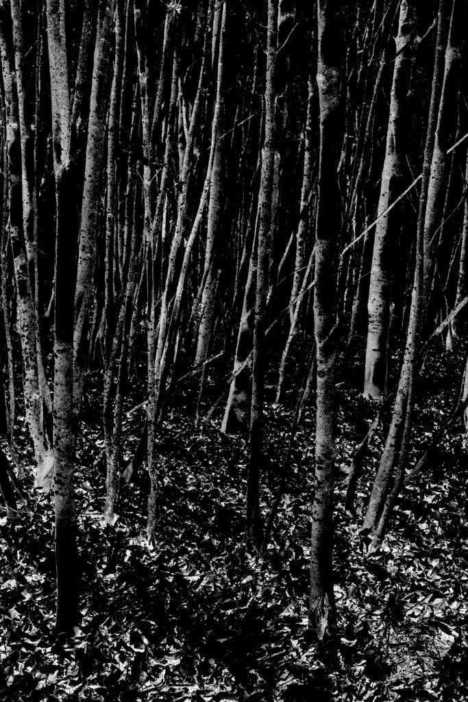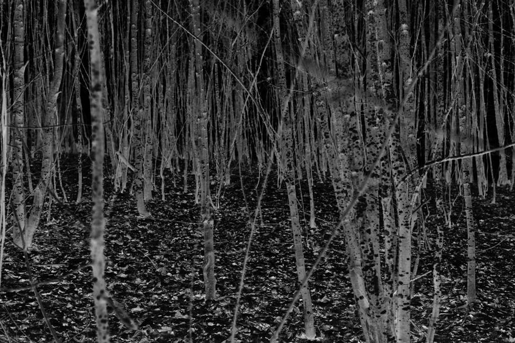 Der Wald wird zur Struktur. Wiederholung und Verdichtung erzeugen ein Bildfeld ohne Zentrum. Wahrnehmung verschiebt sich von Motiv zu System.
